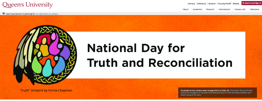 This week, during National Day for Truth and Reconciliation week, Queen’s University featured the Indigenous Illustration, “Truth.” I was commissioned to create these illustrations by the Queen’s Indigenous Initiatives Department for their website. Since then, the illustrations have been beautifully featured as integral elements to the Queen’s University Truth and Reconciliation Task Force Implementation Report – Year 3. This week, “Truth” is being shared on various sites, apps and pages. Also, a Zoom / Microsoft Teams background with the illustration was created so that you can use it for your meeting backgrounds, especially Queen’s departments today. Today is Orange Shirt Day – Every Child Matters. The following is a short video of me explaining the inspiration that guided my creation of this beautiful image.