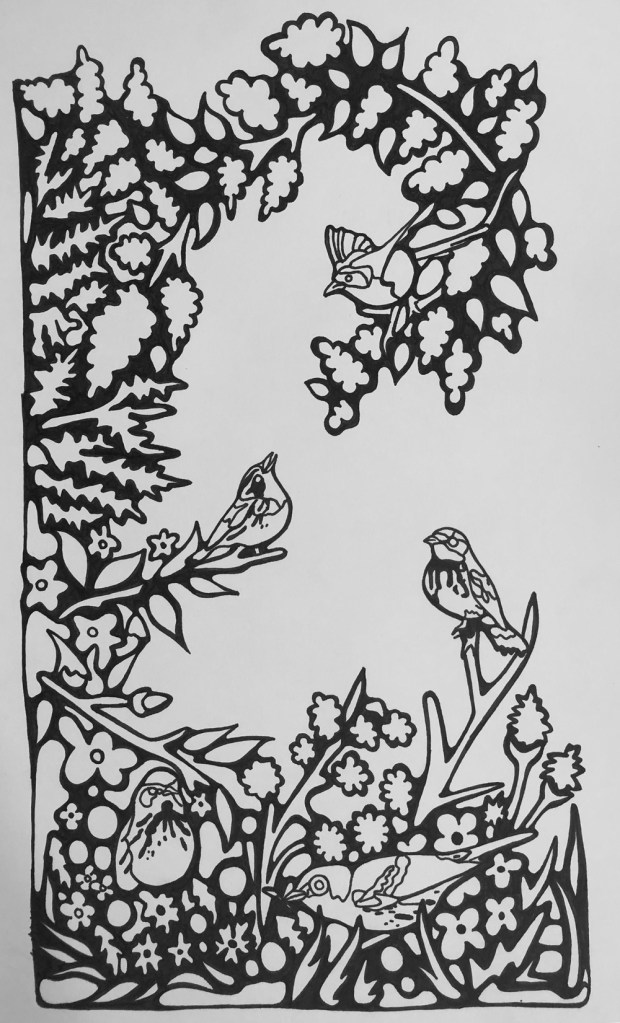 As you can see, the above photograph inspired the composition of the mural. The image below is my initial pen and ink drawing on paper. There were many lilac bushes along Traverse Ln too. However, they had not yet bloomed as depicted in the drawing below.