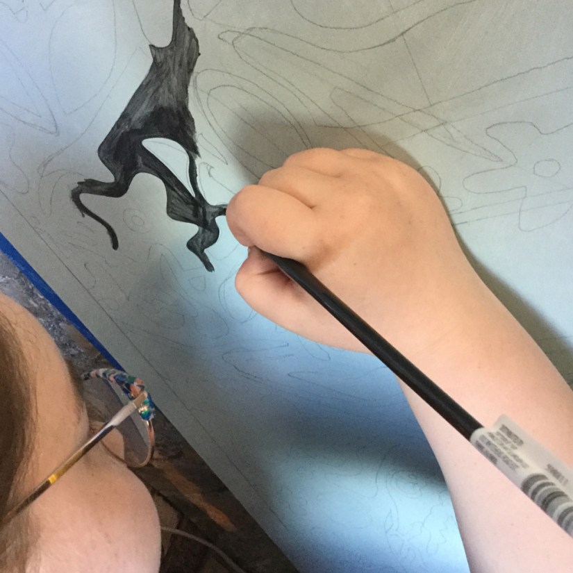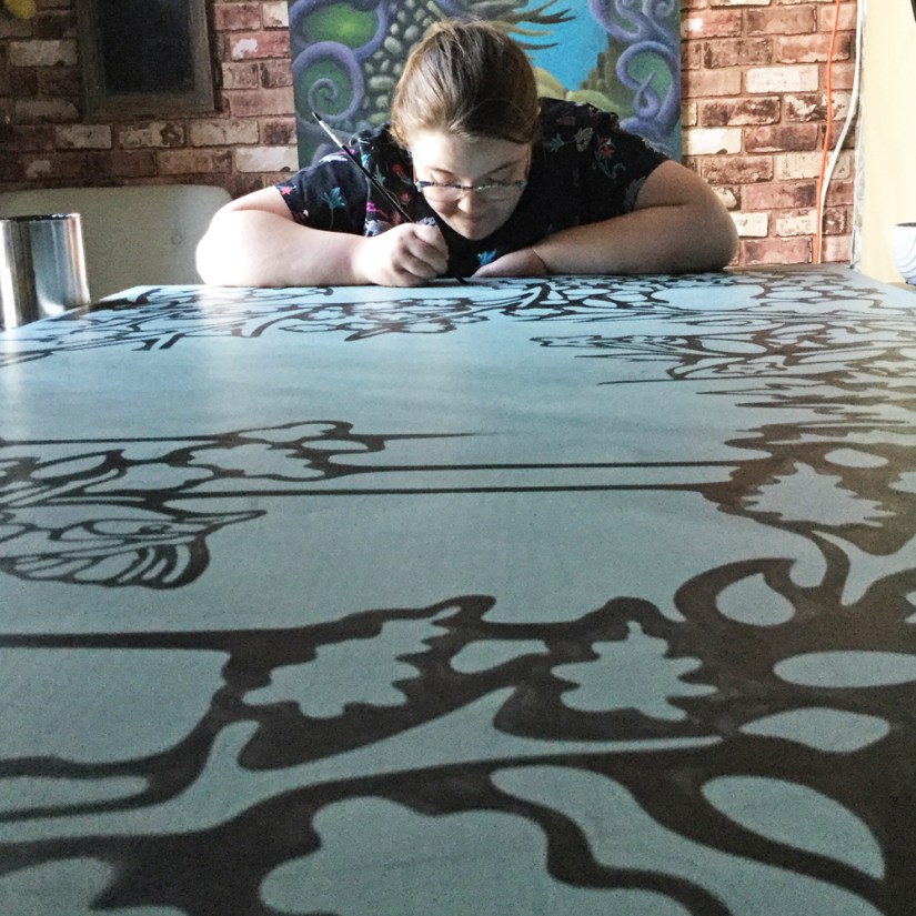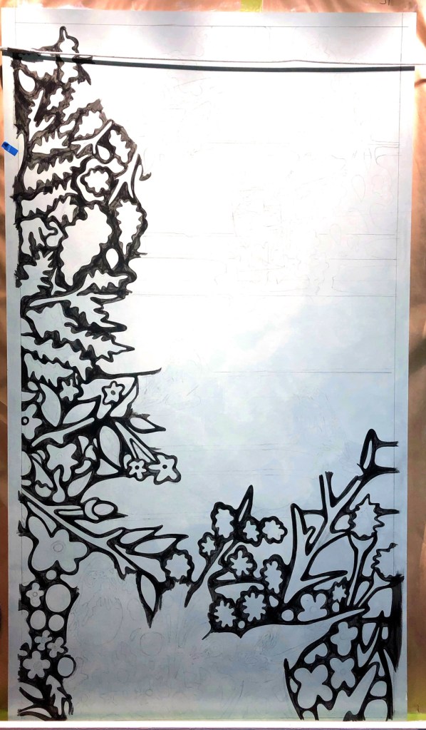 Before drawing the image onto the MDO plywood, I primed the board 2 times – front, back and sides – sanding between coats on the front and edges. Then I caulked the edges and levelled them off smooth with a trowel. Again, once dry, I sanded and then sealed. The face of the board, in the first image, is slightly green because I had the bright white primer tinted. This made the process of drawing and painting a much more peaceful and enjoyable experience. Because my style features smooth, flat colour blocking and draping deep lines elegantly pulled by a variety of brushes, the mural ended up having about 5 coats (7 including the primer coats) of exterior translucent paint using a clear base. You can notice how the first coat appears to be streaky but the objective for the first coat is to capture the flow of the desired image while assuring minimal brush stroke ripples. The thinner the first coat, the better. For exterior murals such as this one, I prefer painting multiple thin coats to assure durability.