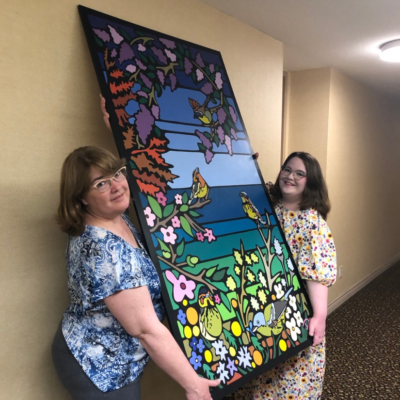 I find such joy standing beside my artwork after it has been installed on the desired site. This photo was taken at Base 31 in Picton, Ontario, during the Aviator Garden murals’ unveiling event.