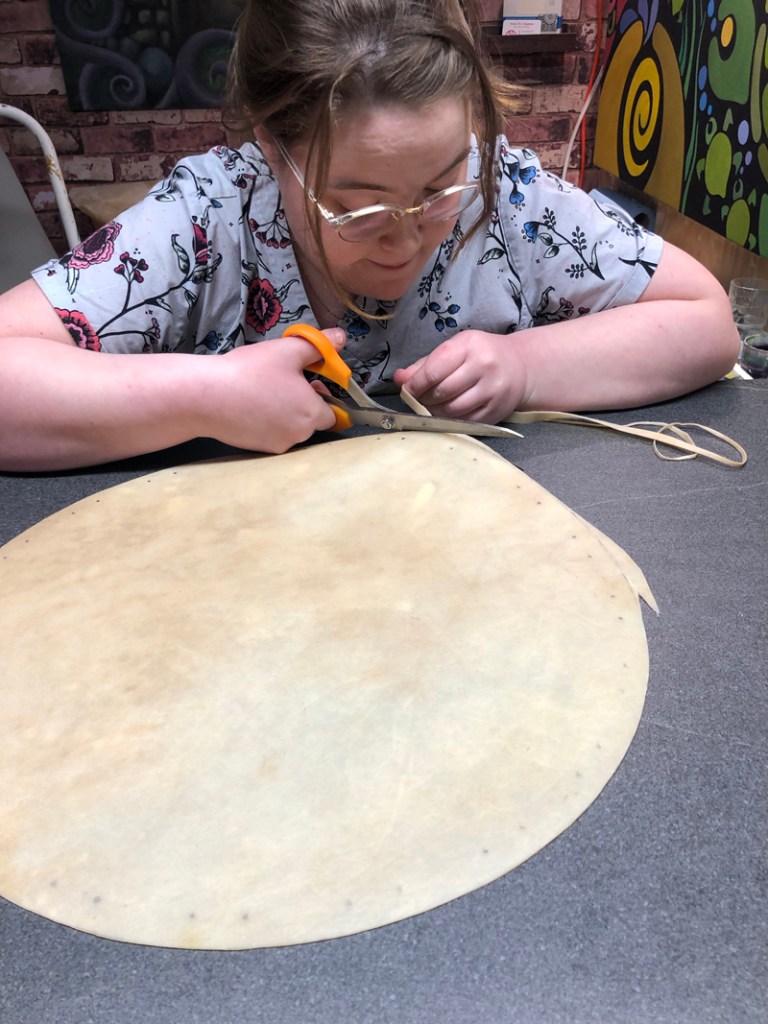 Cutting rawhide is fairly easy to do if the hide is thin. In this step-by-step guide, I am using opaque elk because this drum head will be painted. Elk and deer are from the same family. Deer is typically the more thin of the two. I will be posting another guide concerning the different rawhides, but for now a rule of thumb is: 14″D and smaller drums use deer or elk. In the photo at the top of this post, I am stringing a 14″ D drum with a coiled white cedar frame that I have painted. In order to cut thin elk, I find that using kitchen sheers or fabric scissors does a good job.